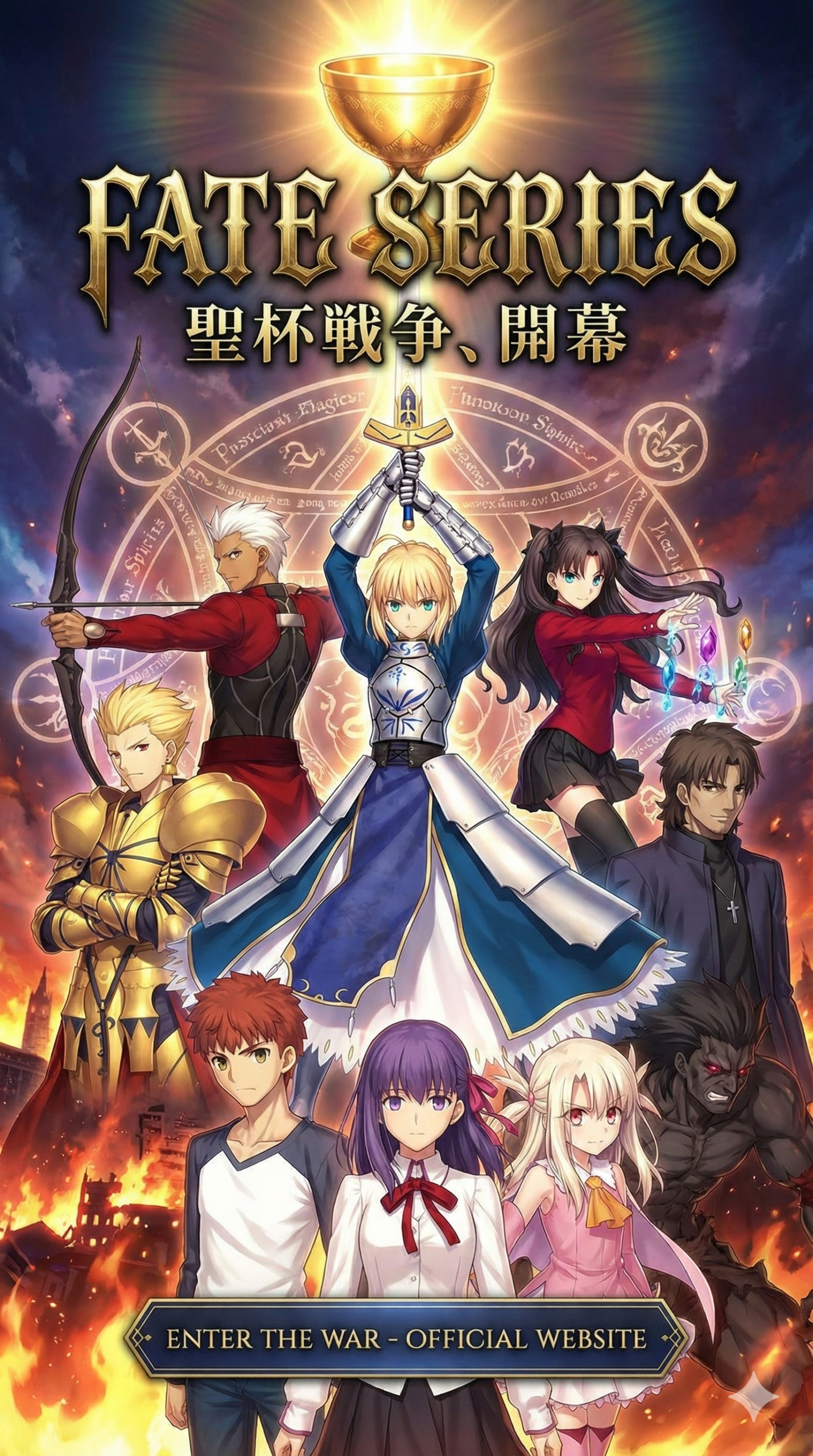 - 這是所有故事的原點。講述平凡高中生衛宮士郎無意間召喚了最強英靈Saber(亞瑟王),並捲入聖杯戰爭的故事。漫畫版有多個版本,分別對應遊戲的不同路線(如「Fate線」、「UBW線」、「HF線」)。